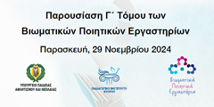 Εκδήλωση για την παρουσίαση του Γ' Τόμου των Βιωματικών Ποιητικών Εργαστηρίων για τη σχολική χρονιά 2023-2024 υπό τον γενικό τίτλο: «Μια χαραμάδα στο κλειστό παράθυρο να γίνει δύναμη ζωής. Από αύριο τα σφάλματά μας θα γίνουν δύναμη και φως», Παρασκευή, 29 Νοεμβρίου 2024